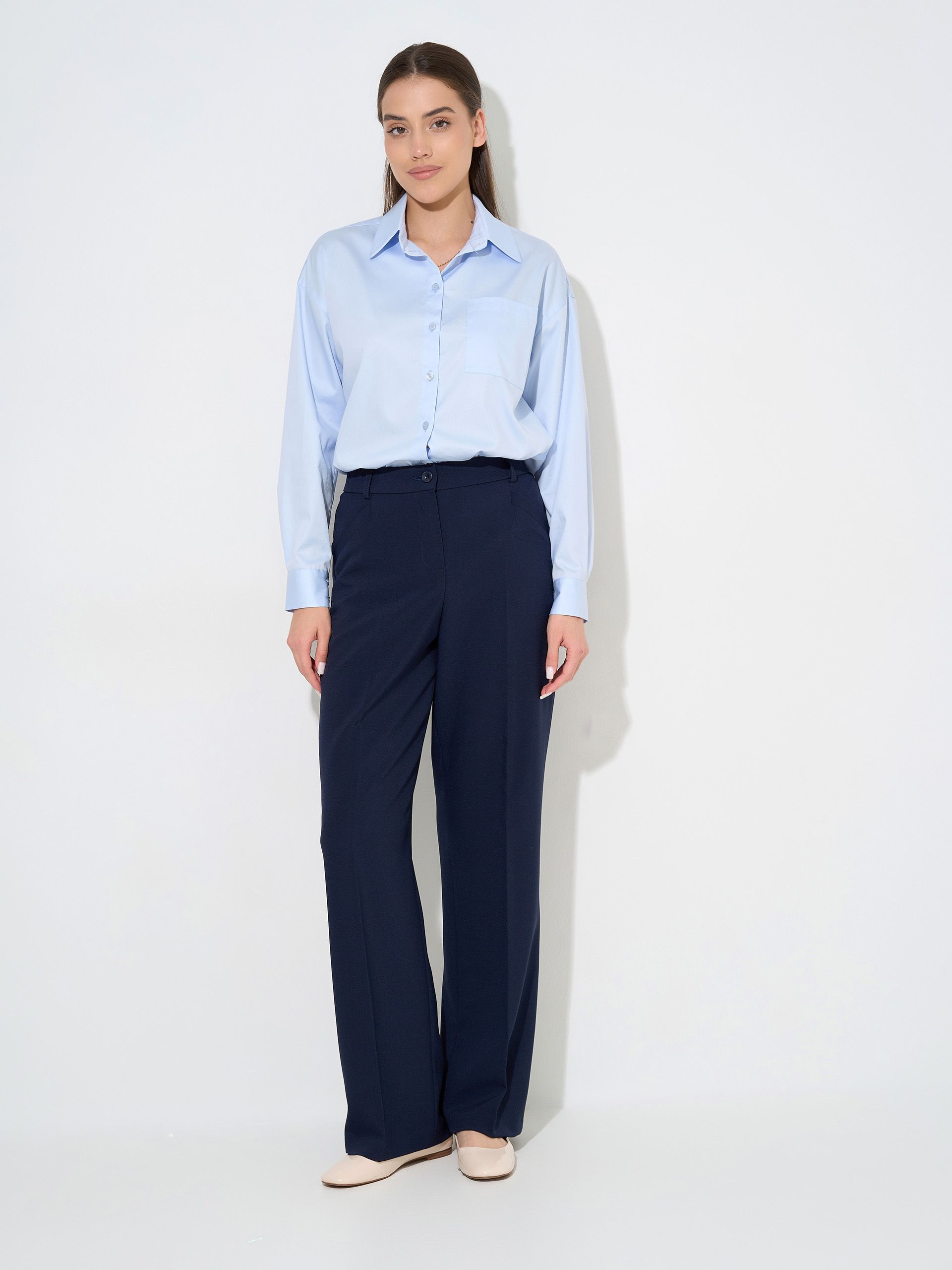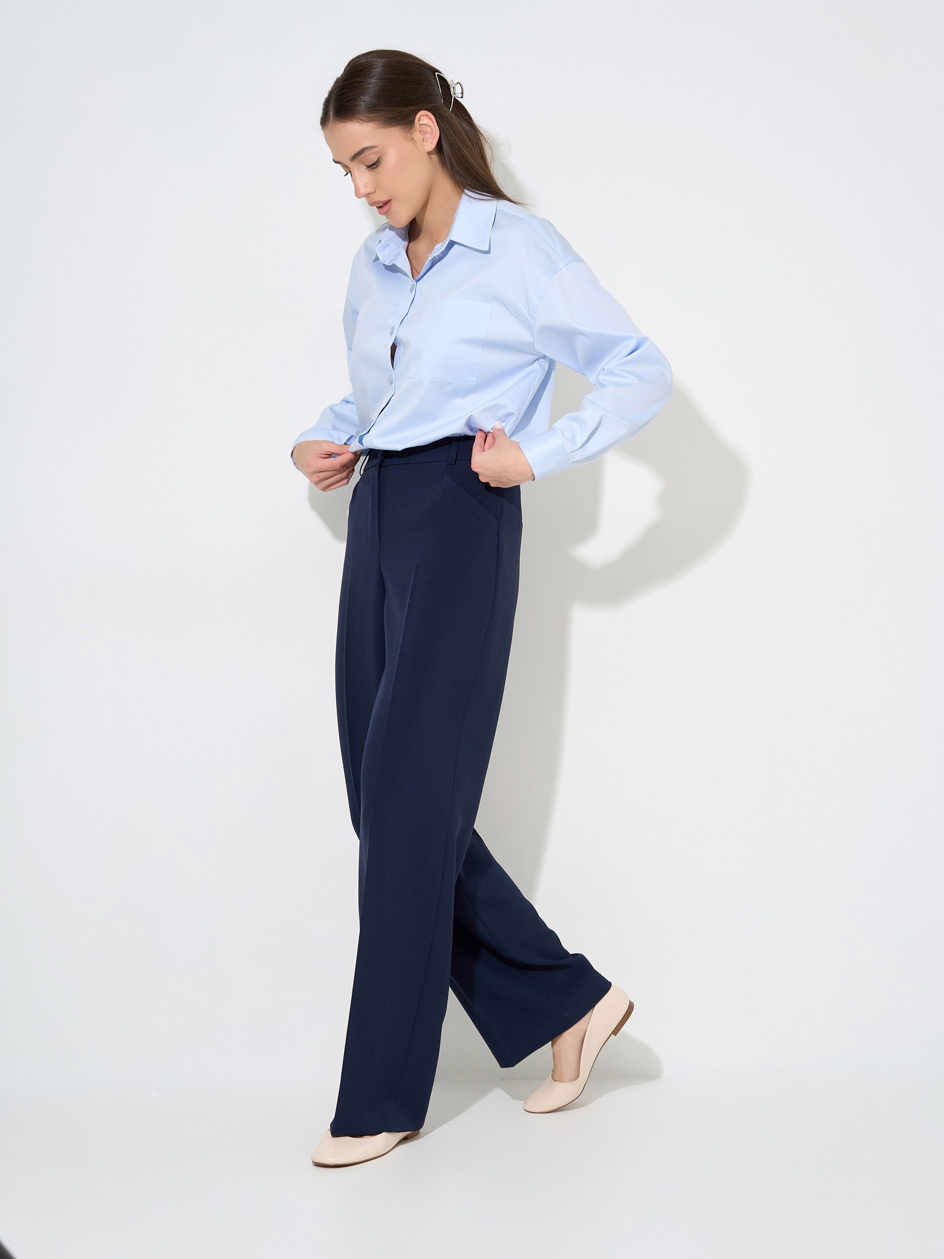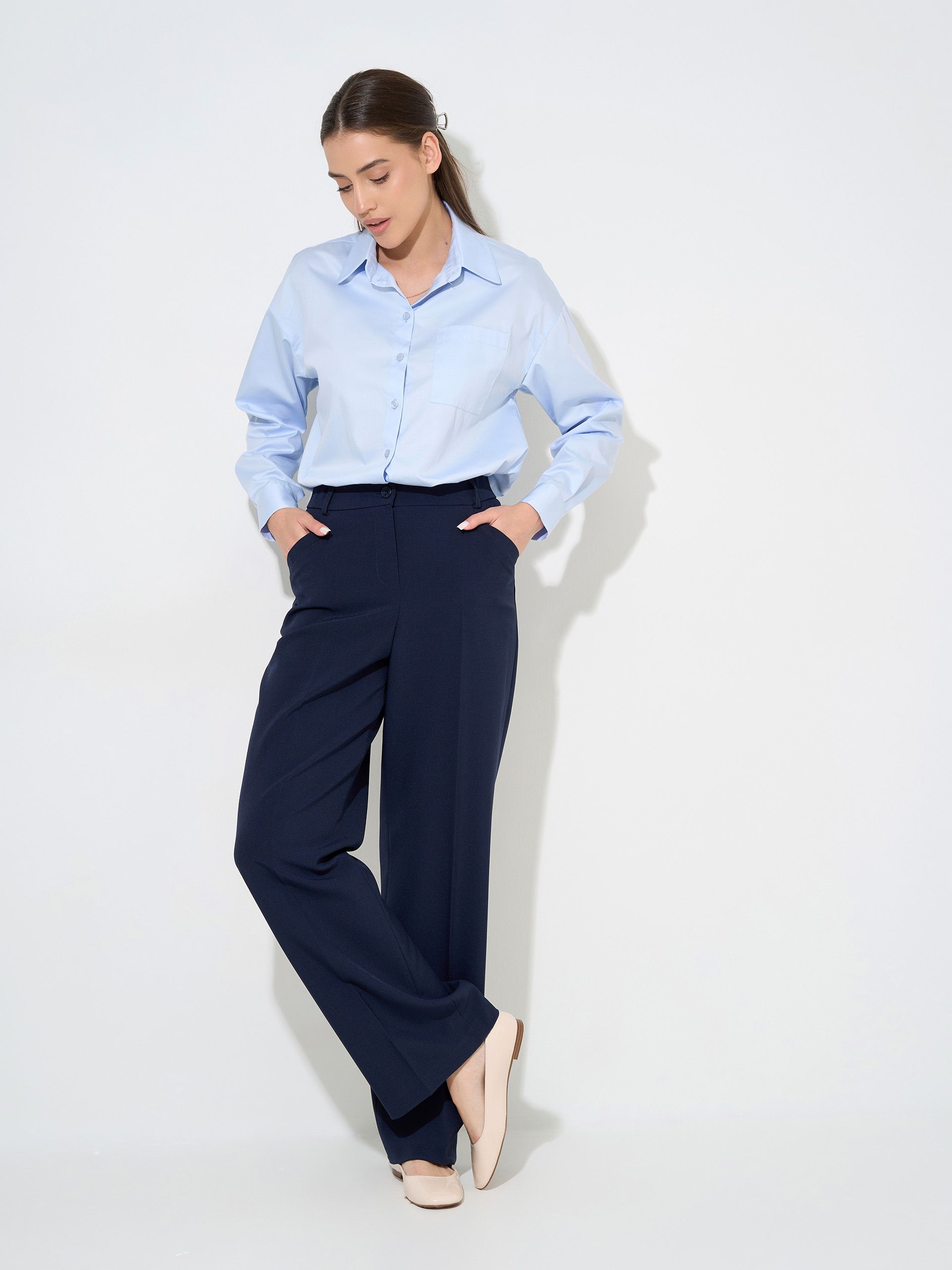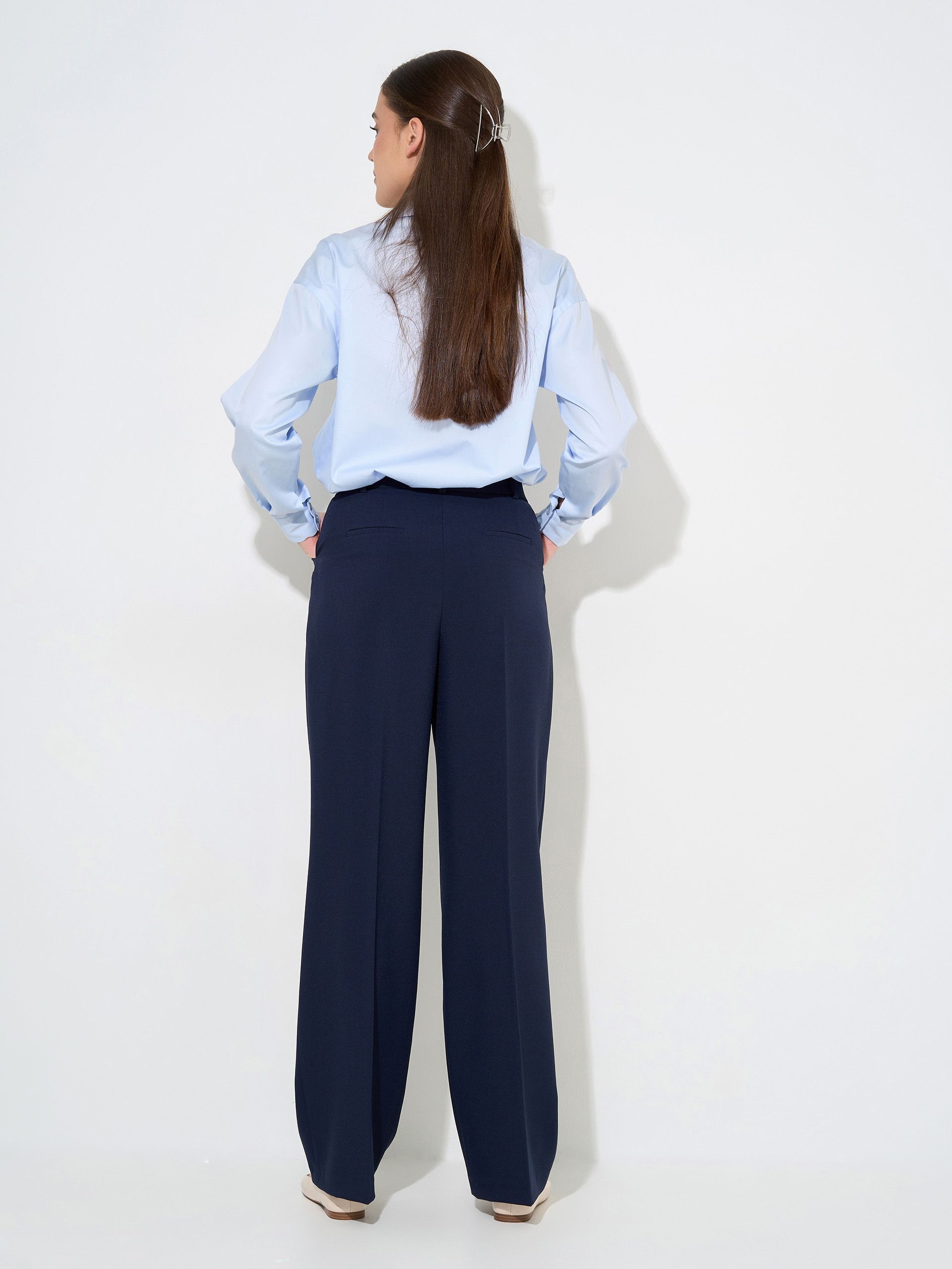 Брюки с декоративными карманами. Резинка в поясе, прямой свободный силуэт. Из средней по плотности струящейся костюмной ткани. Цвет темно-синий.